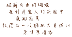首頁優雅好茶原味茶葉系列 忘憂泉 春神的擁抱 仲夏夜之夢 麥穗的晚禱 東方美人 尋夢谷 靜思路 女人香 花纖蜜公主 忘憂泉 忘憂泉下的自在飛舞 清甜泉水沉穩的安定心靈 阿里山烏龍茶 加入購物車 春神的擁抱 飲下柔滑順口紅茶 彷彿受到春神的眷顧 阿里山紅茶 加入購物車 仲夏夜之夢 仲夏夜晚悄悄的溜進森林邊境 讓妳輕輕墜入夢中 日月潭紅玉紅茶 加入購物車 加入購物車 加入購物車 加入購物車 麥穗的晚禱 平凡樸實的茶麥香撲鼻而來 感受到的是晚禱後的平淡知足 黃金韃靼蕎麥茶 加入購物車 加入購物車 加入購物車 加入購物車 東方美人 你不經意的輕吻 掀開了香甜迷人神祕面紗 白毫烏龍茶 尋夢谷 谷空靈 渾然天成 幻化出潤滑高雅的茶中極品 梨山高山茶 靜思路 微火慢焙轉化出厚實的甜香 沉澱紛擾的心靈 回首來時路 凍頂烏龍茶 女人香 花香、茶香、奶香共舞 織成無法抗拒的獨特魅力 阿里山高山金萱茶 加入購物車 加入購物車 加入購物車 花纖蜜公主 身材纖細的蜜香公主 散發出冷悠的清新花香 婀娜地保持著自己的低調華麗 四季蜜紅茶 加入購物車 加入購物車 加入購物車 加入購物車